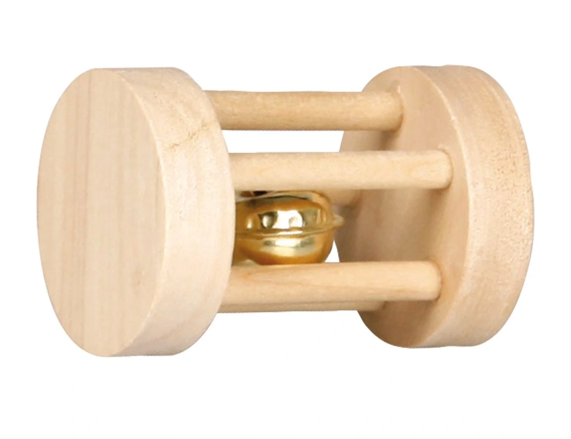 KEMİRGENLER İÇİN ÇINGIRAKLI, AHŞAP SİLİNDİRİK OYUNCAK. KENERLARI YUVARLATILMIŞTIR. DOĞAL AHŞAPTAN. 7 * 5 CM.