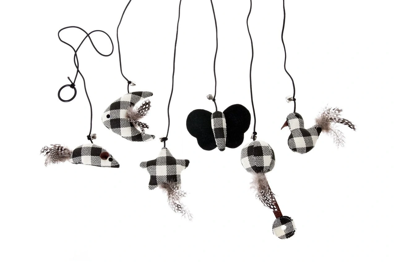 Kedi Oyuncakları "Twinies black-white", kabaca dokunmuş, jüt benzeri kumaşın damalı görünümüyle ilham veriyor, Pençelerle mükemmel bir şekilde işlenebilir ve ekli tüyler ve Çan her zaman yeni oyun turlarına ilham verir